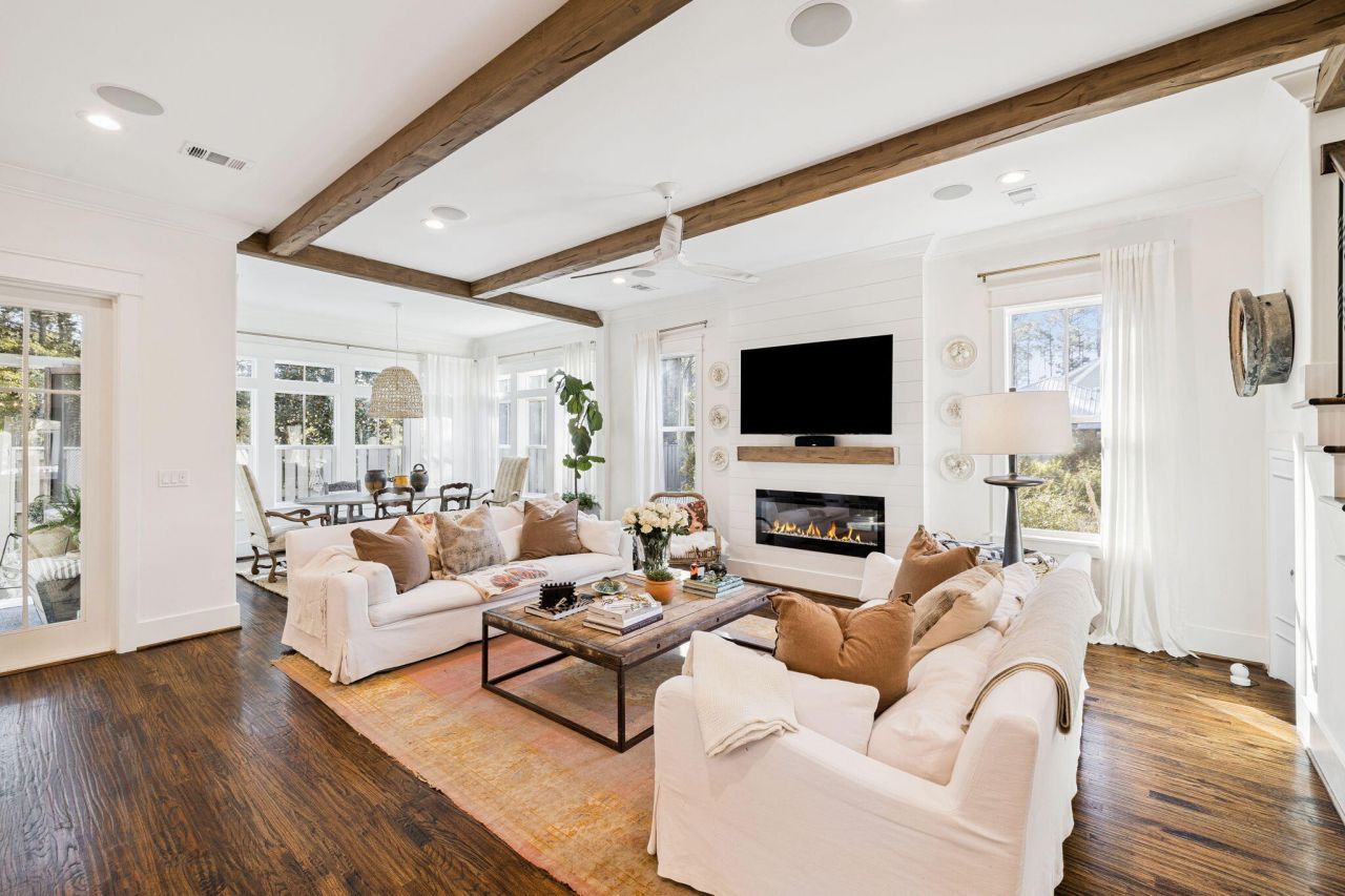 Experience the pinnacle of Coastal Elegance at 93 Eastern Lake Court, an exquisite 4-bedroom, 4.5-bath estate situated south of Scenic Highway 30A in the prestigious enclave of Seagrove Beach. Spanning 2,700 square feet of masterfully curated living space, this residence is a symphony of timeless architectural detail and sophisticated modern amenities, designed for the most discerning homeowner.The home's interior reveals a grand open-concept floor plan, characterized by hand-scraped hardwood flooring, dramatic wood-beam ceilings, and a sleek electric fireplace that serves as a centerpiece for refined relaxation. The culinary suite is a masterpiece of design, featuring ceiling-height bespoke cabinetry, premium professional-grade appliances, and expansive stone countertops and deal stage for high-end entertaining.Every detail has been thoughtfully considered, from the charming, artisanal reading nook to the convenience of dual laundry suites on both levels. The Owner's Retreat on the second floor offers an unparalleled sanctuary, featuring a private enclosed balcony that serves as a quiet vantage point for the morning sun or an evening glass of vintage wine. Two additional guest suites and a flex space room that is ideal for an office or kid's room. The exterior is an extension of the home's grace, offering three private porches including two screened-in verandas overlooking the lush, protected preserve that borders the property. Owners enjoy an enviable proximity to the crystalline waters of the Gulf of Mexico, Eastern Lake's rare coastal dune waters, and an exclusive community pool. Some furniture will convey.